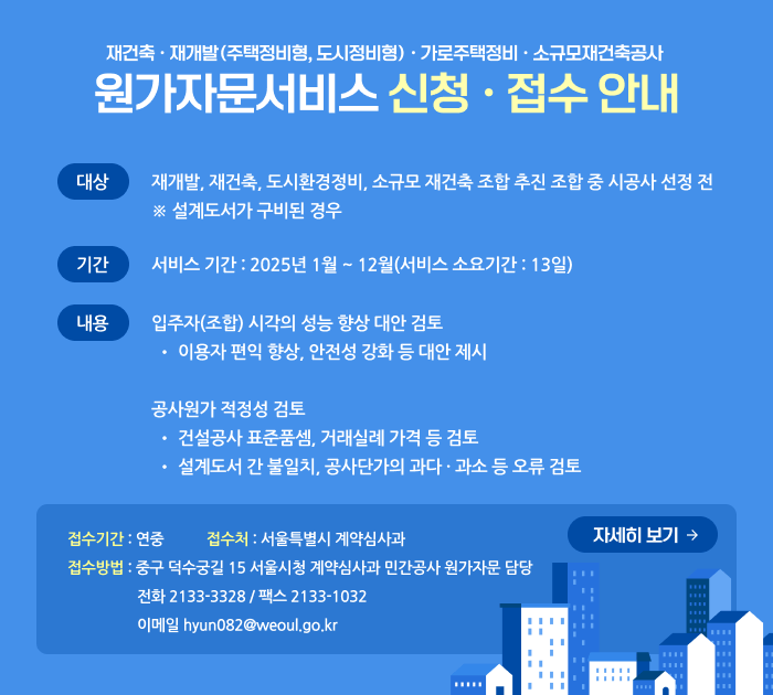 재건축ㆍ재개발(주택정비형, 도시정비형)ㆍ가로주택정비ㆍ소규모재건축공사 원가자문서비스 신청·접수 안내