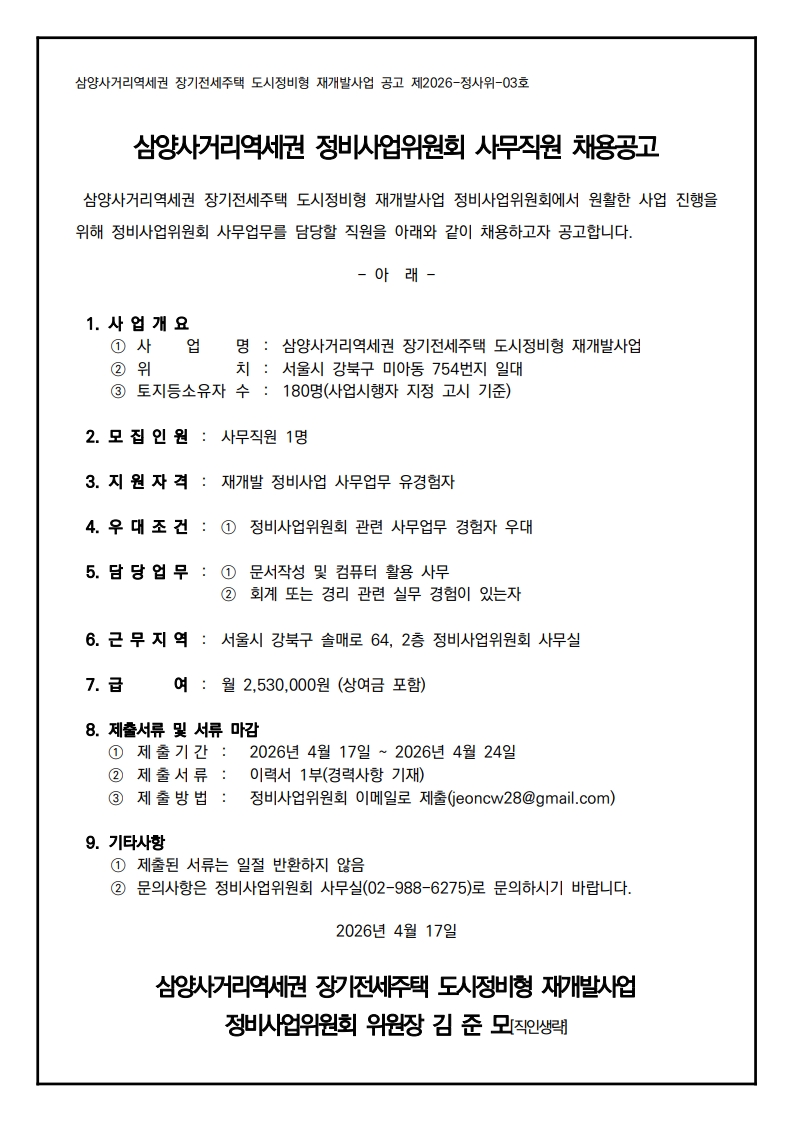 삼양사거리역세권 정비사업위원회 사무직원 채용공고