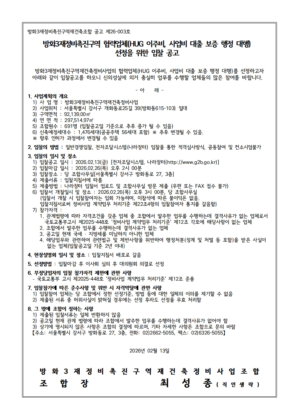 방화3재정비촉진구역 협력업체(HUG 이주비, 사업비 대출 보증 행정 대행) 선정을 위한 입찰