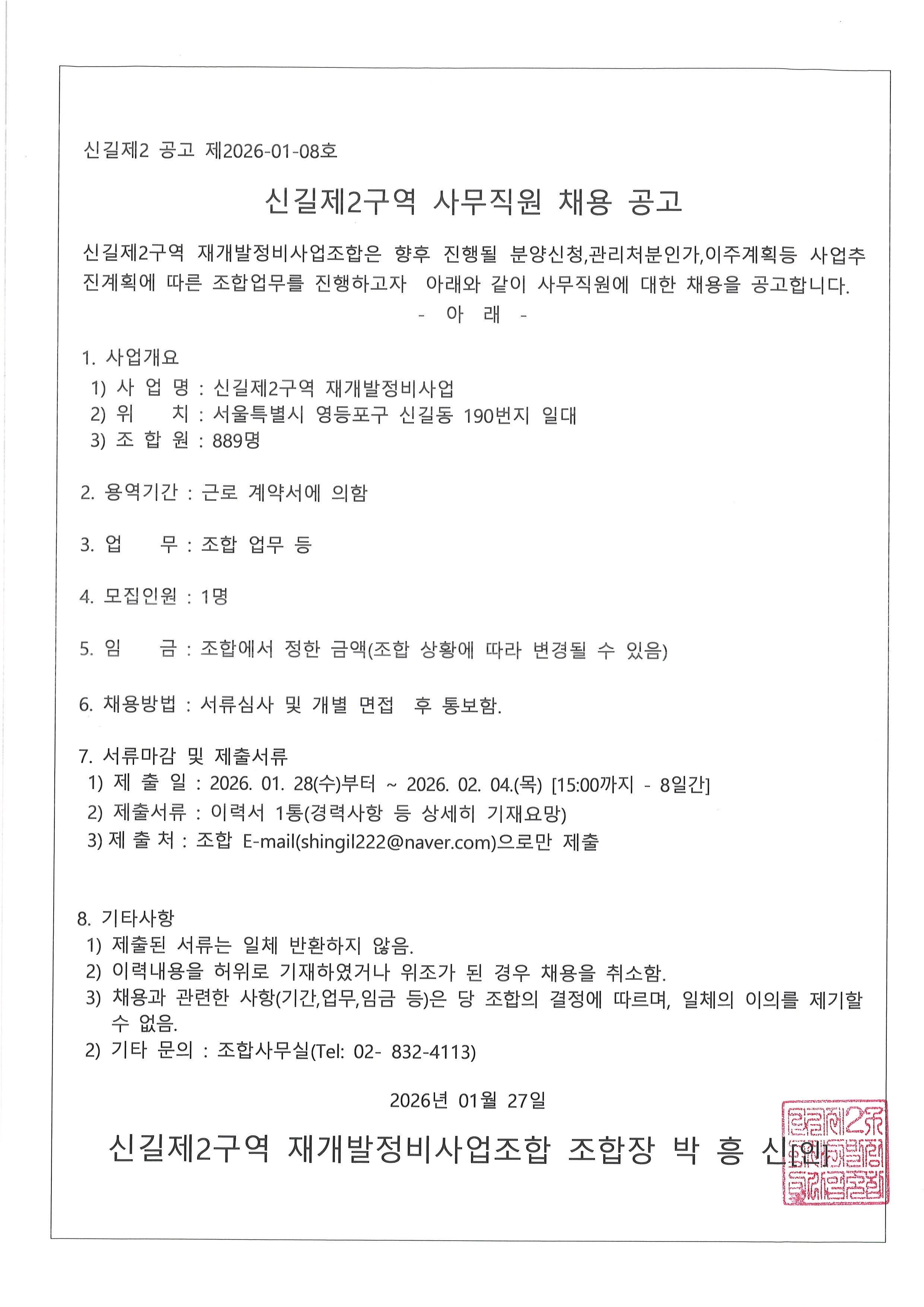 신길제2구역 사무직원 채용 공고