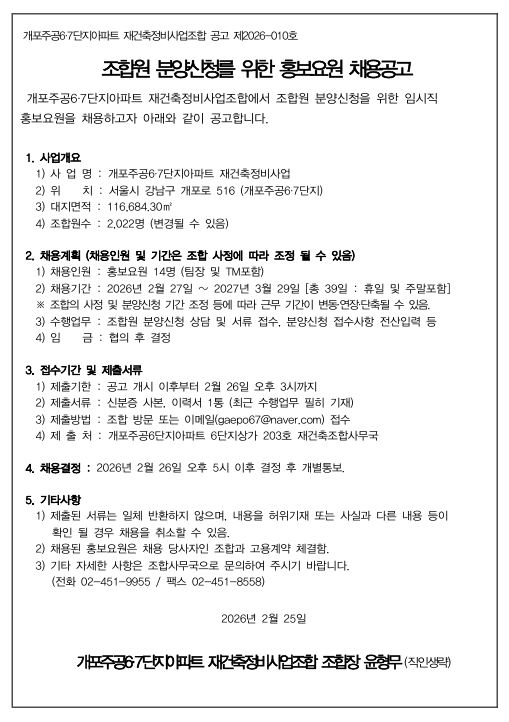 조합원 분양신청을 위한 홍보요원 채용공고