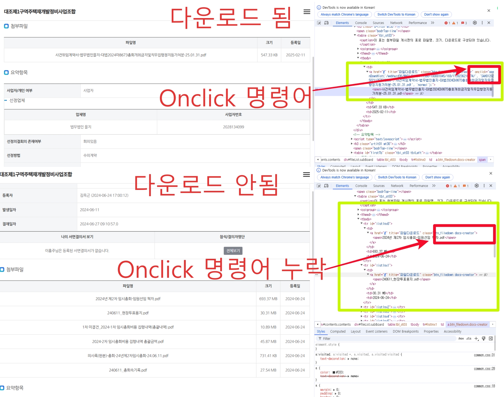 정보공개 게시물 일부 파일 다운로드 안되는 현상 스크립트 click 명령어 누락