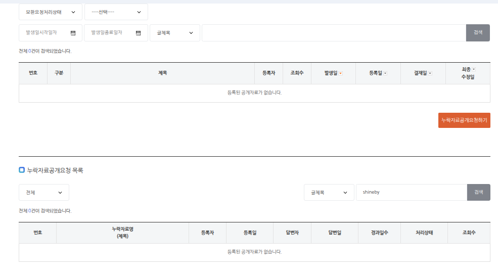 오늘 정보업데이트가 되었다는 메일을 받았지만 아래와 같이 정보요청 요청건 및 완료에 대한 리스트를 볼 수 없는 상태입니다.