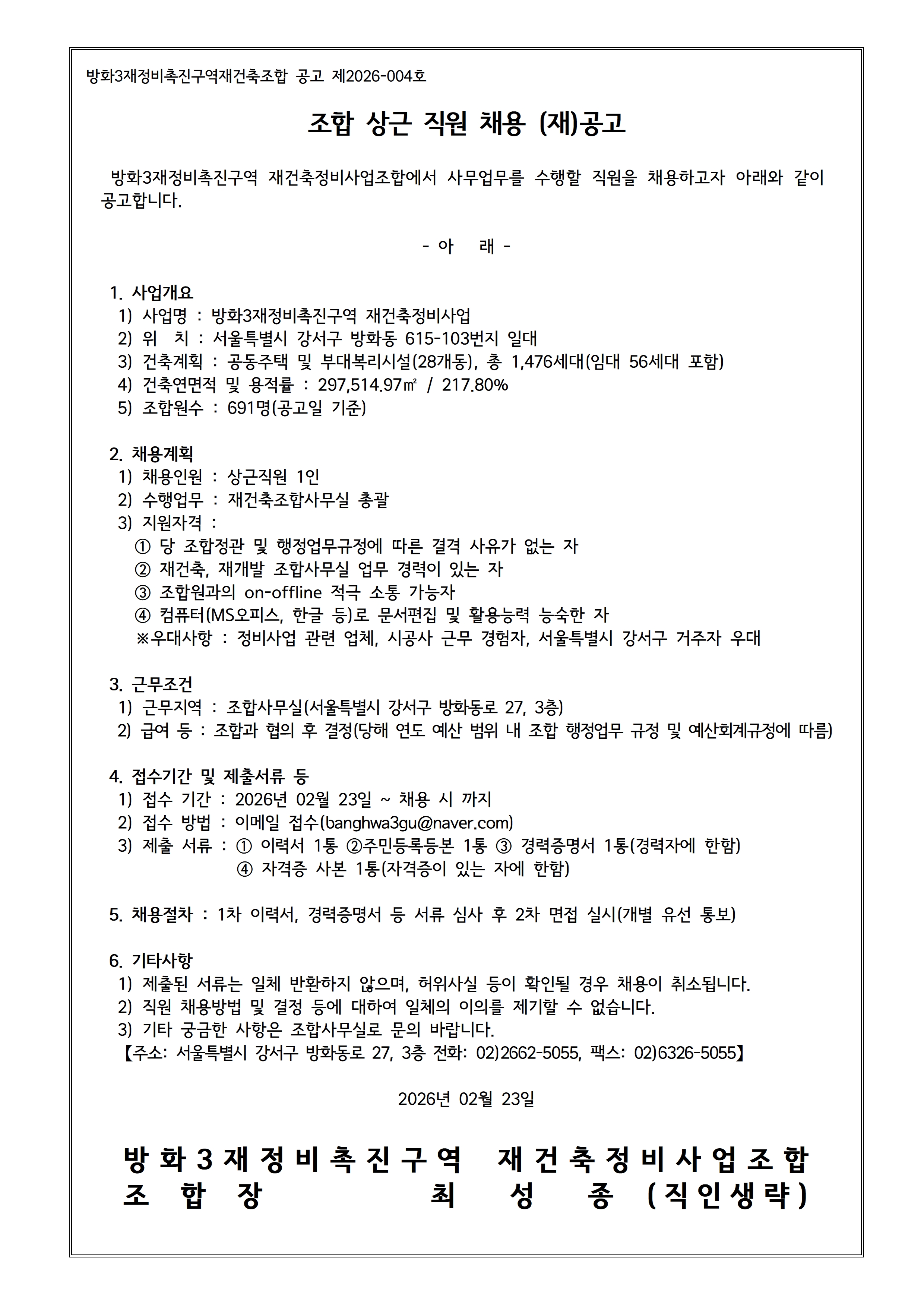 입찰명 : 조합 상근 직원 채용 (재)공고
