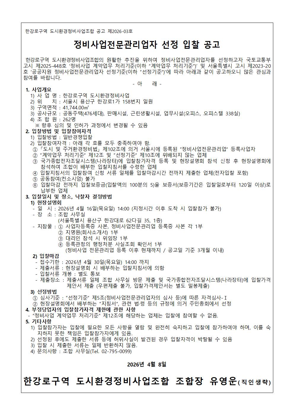 정비사업전문관리업자 선정 입찰 공고