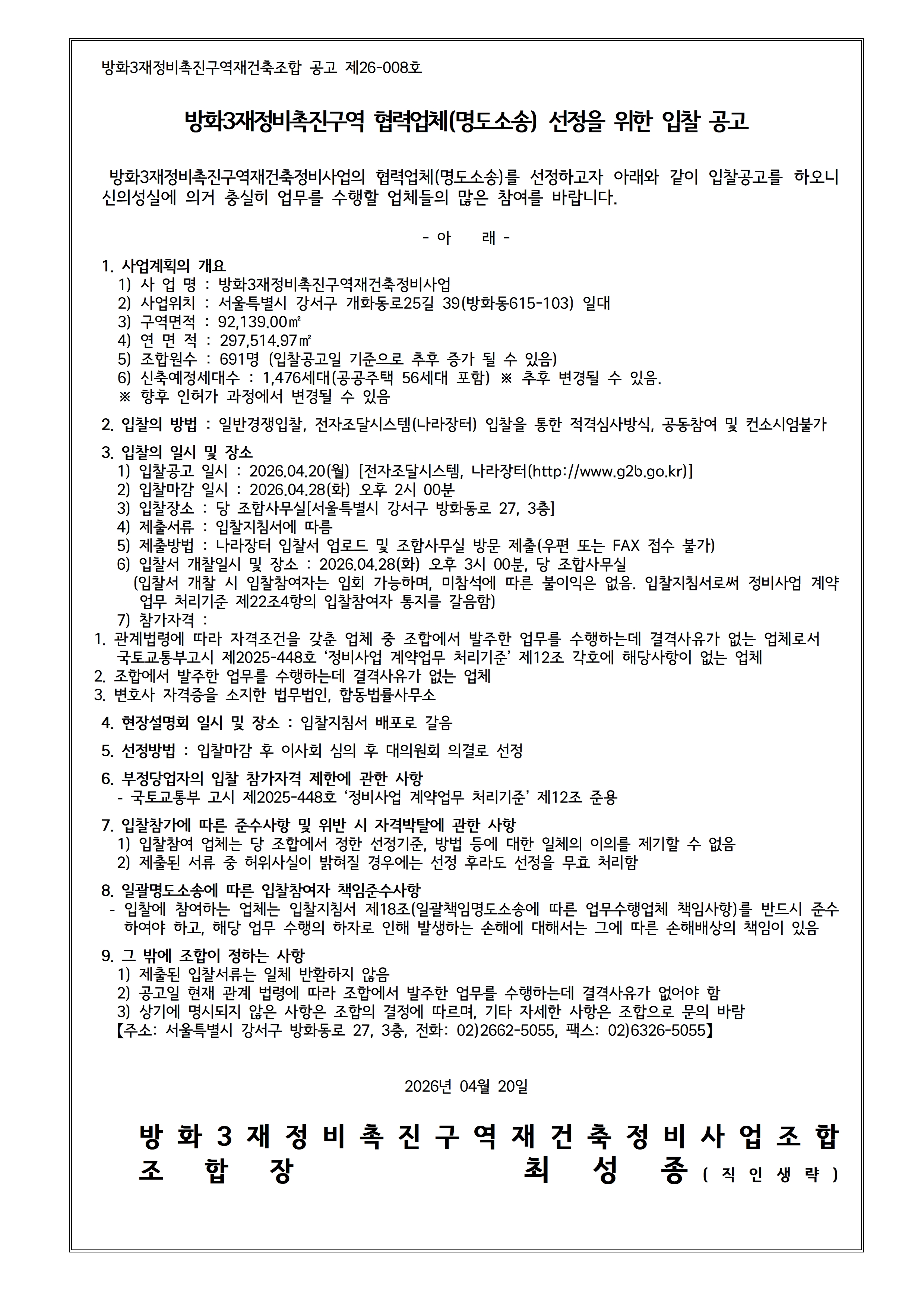 방화3재정비촉진구역 명도소송 협력업체 선정을 위한 입찰 공고