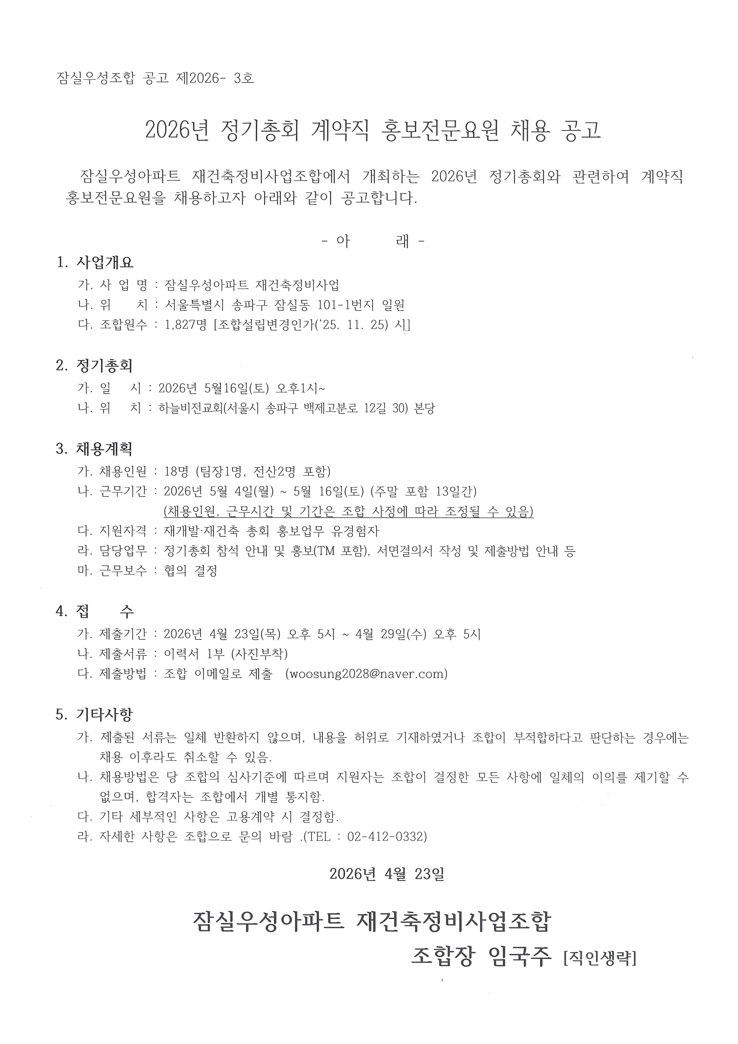 입찰명 : 2026년 정기총회 계약직 홍보전문요원 채용공고