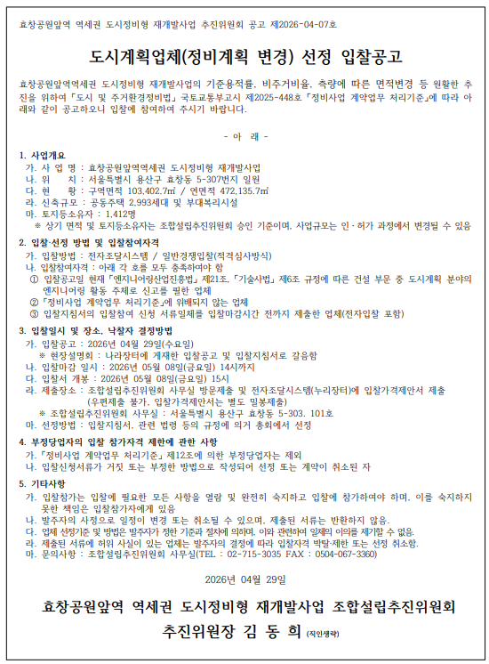 도시계획업체(정비계획 변경) 선정 입찰공고(제2026-04-07호)