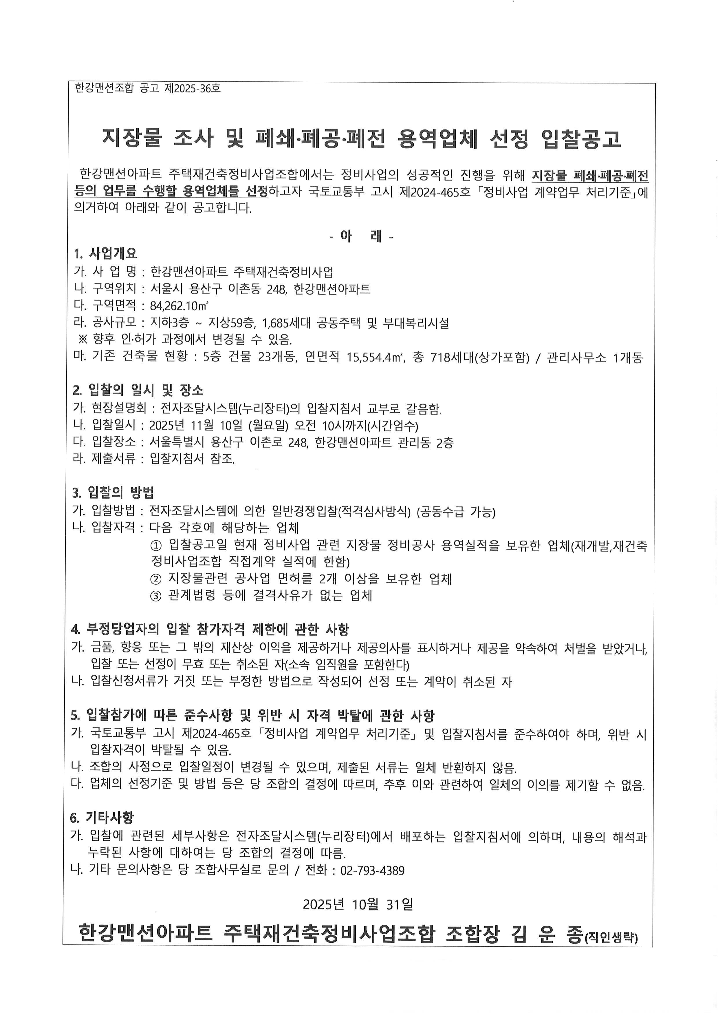 추진위원회/조합명 : 한강맨션아파트 주택재건축 조합