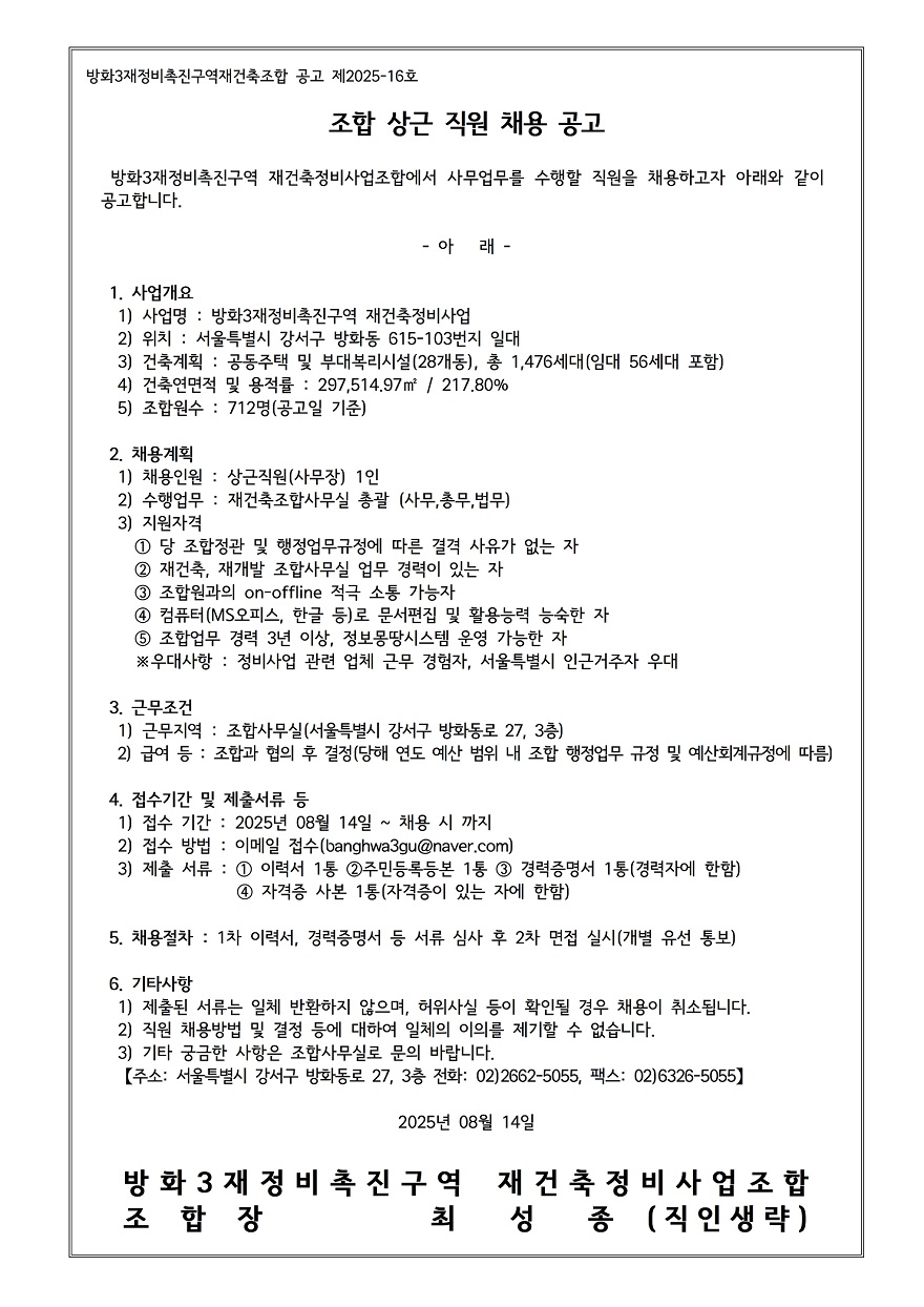입찰명 : 조합 상근 직원 채용 (재) 공고