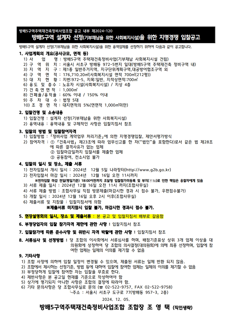 입찰명 : 방바5구역 설계자 선정(기부채납을위한사회복지시설)을 위한 지명경쟁 입찰 공고