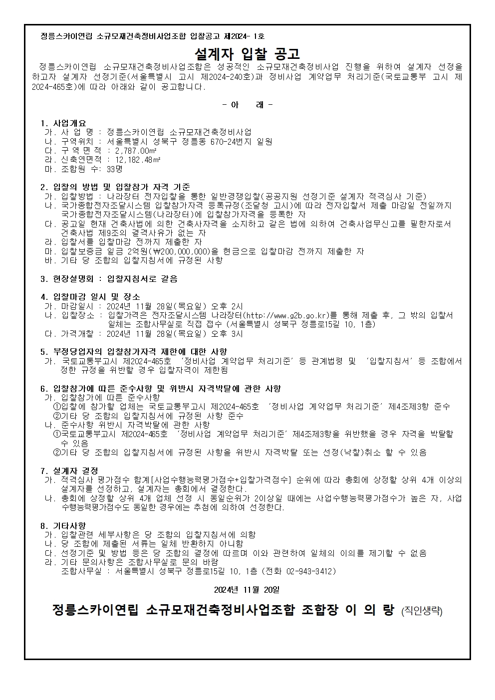 입찰명 : 정릉스카이연립 소규모재건축정비사업조합 설계자 입찰