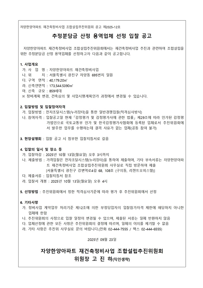 입찰명 : 자양한양아파트 재건축정비사업 조합설립추진위원회 추정분담금 산정 용역
