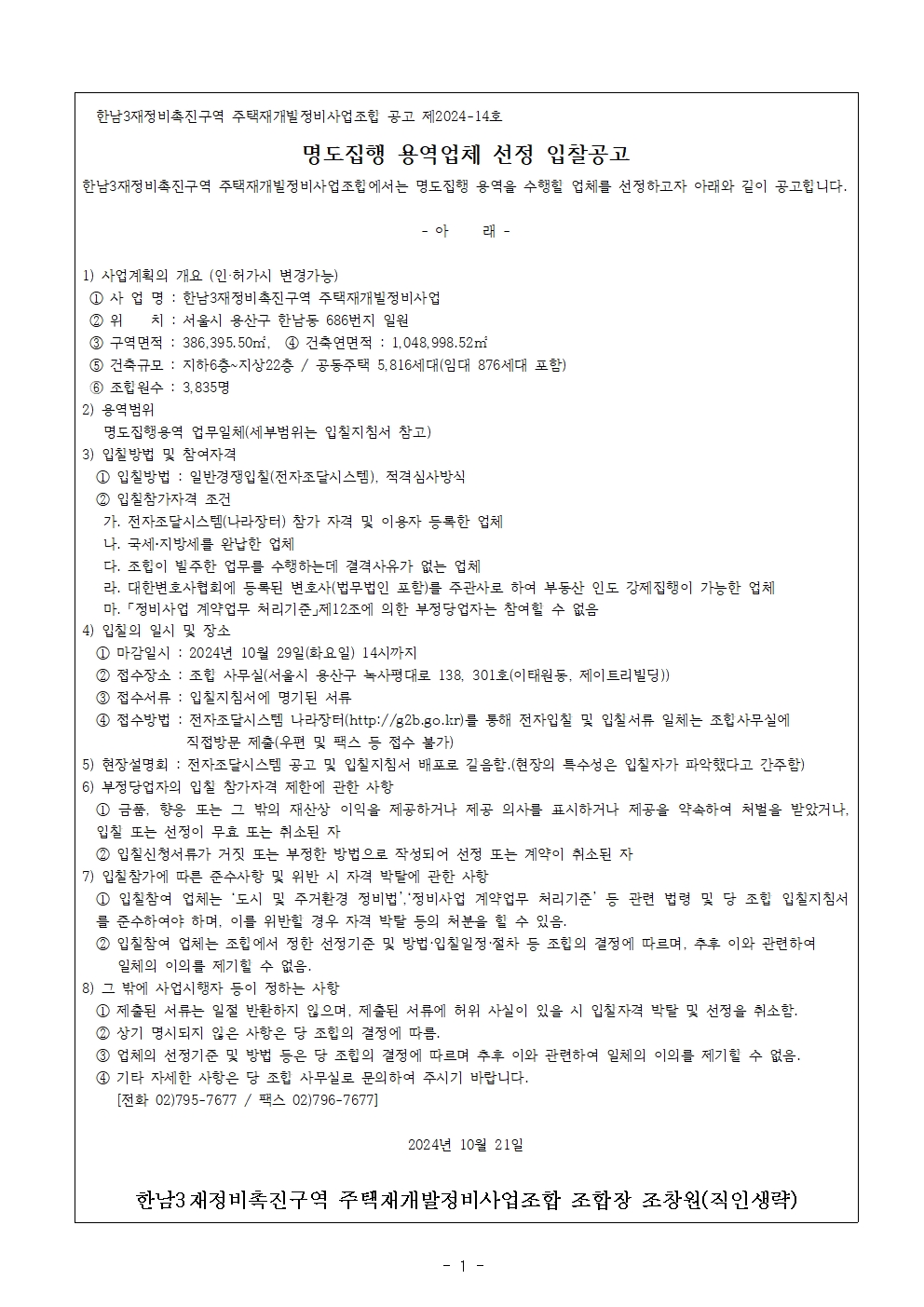 입찰명 : 241010 명도집행 용역업체 선정 입찰공고