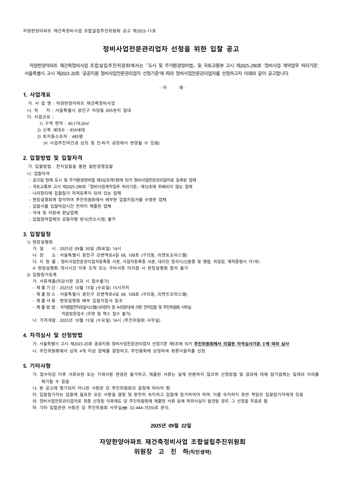 입찰명 : 자양한양아파트 재건축정비사업 정비사업전문관리용역