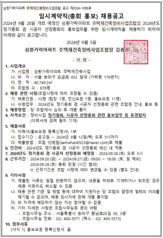 2024년 정기총회 및 시공자선정총회 임시계약직홍보요원 채용 공고