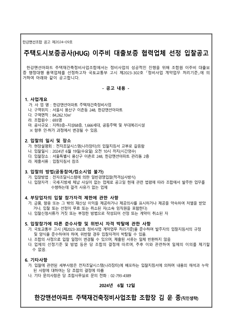 주택도시보증공사 (HUG) 이주비 대출보증 협력업체 선정 입찰공고