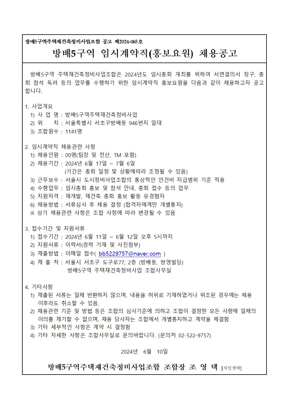방배5구역 2024년 임시(관리처분)총회 임시계약직(홍보요원) 채용 공고