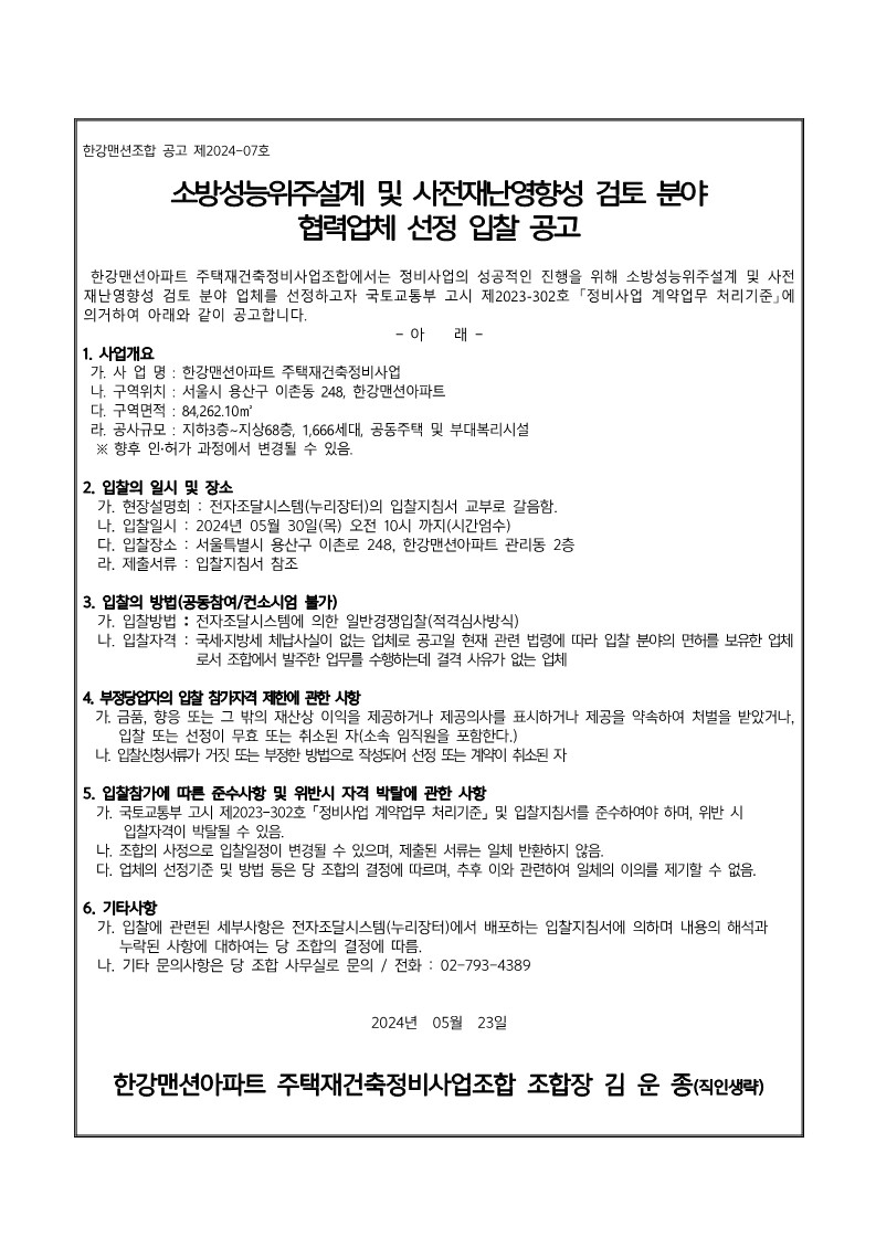 입찰명 : 소방성능위주설계 및 사전재난영향성 검토 분야 협력업체 선정 입찰 공고