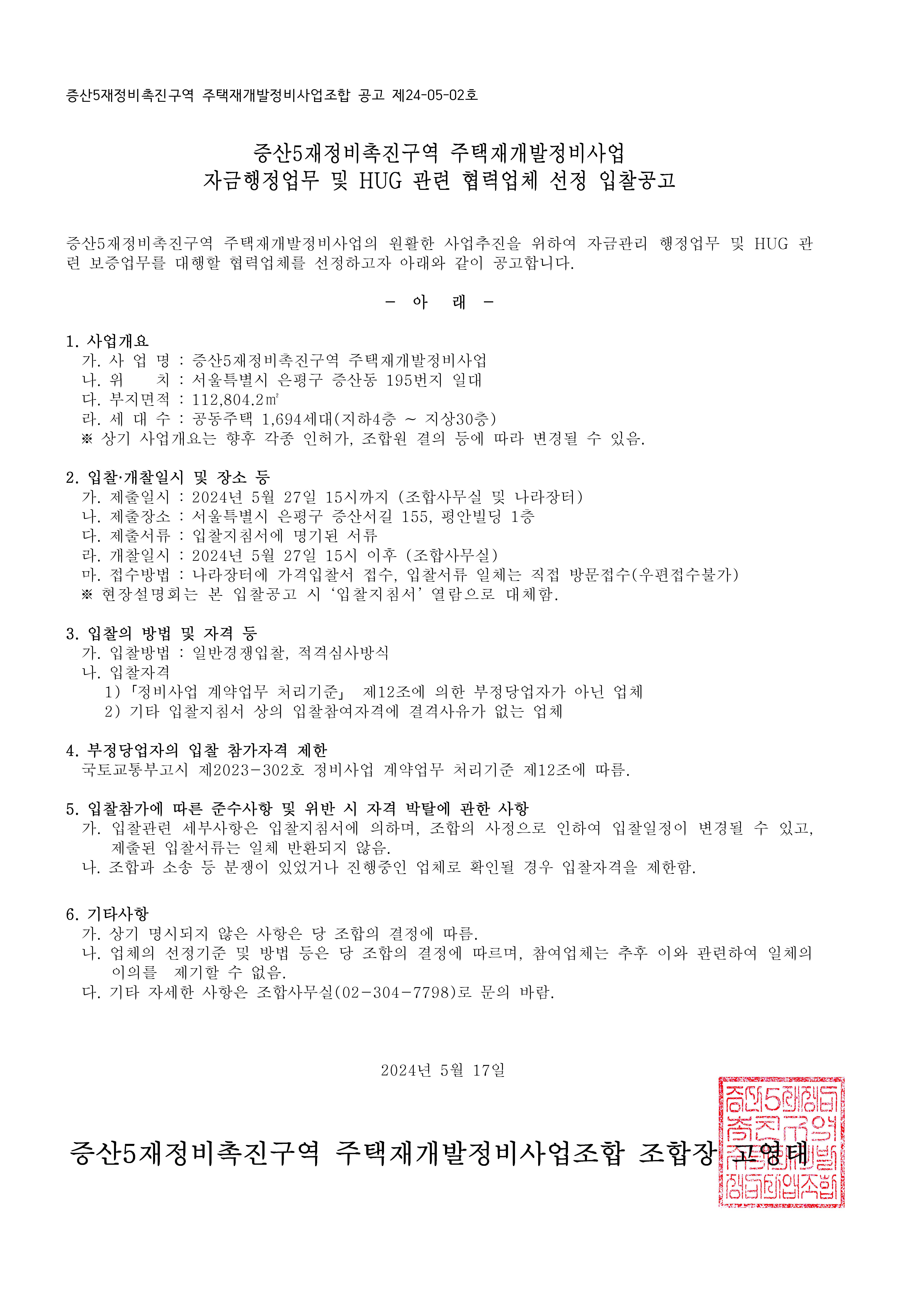 자금행정업무 및 HUG 관련 협력업체 선정 입찰공고