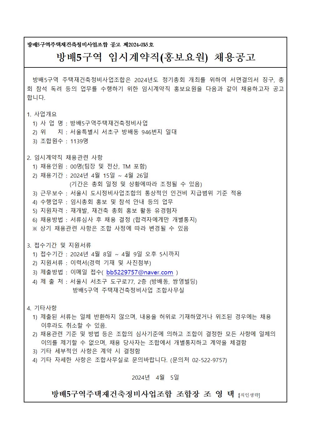 방배5구역 2024년 정기총회 임시계약직(홍보요원) 채용 공고