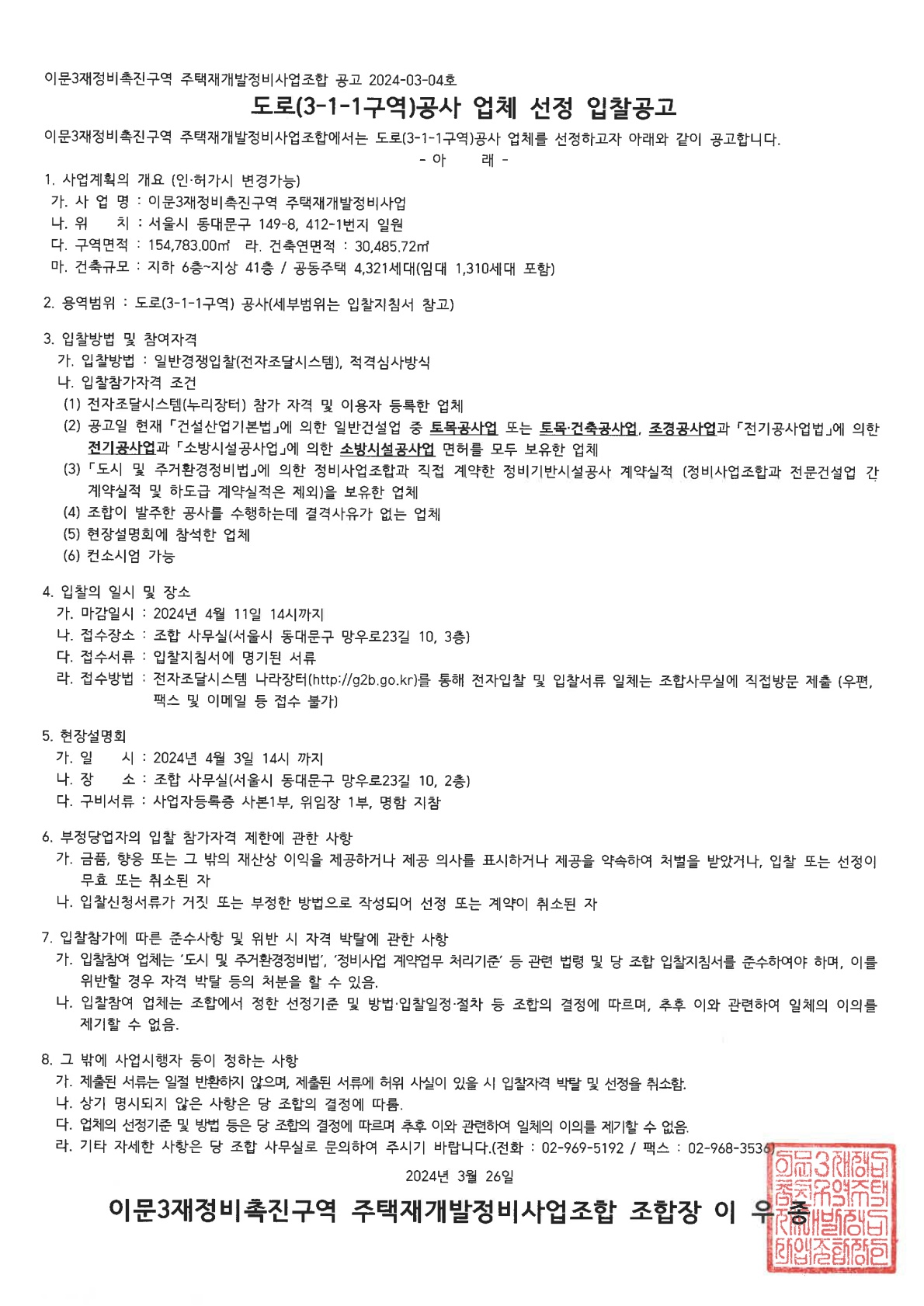입찰명 : 도로(3-1-1구역)공사 업체 선정 입찰공고