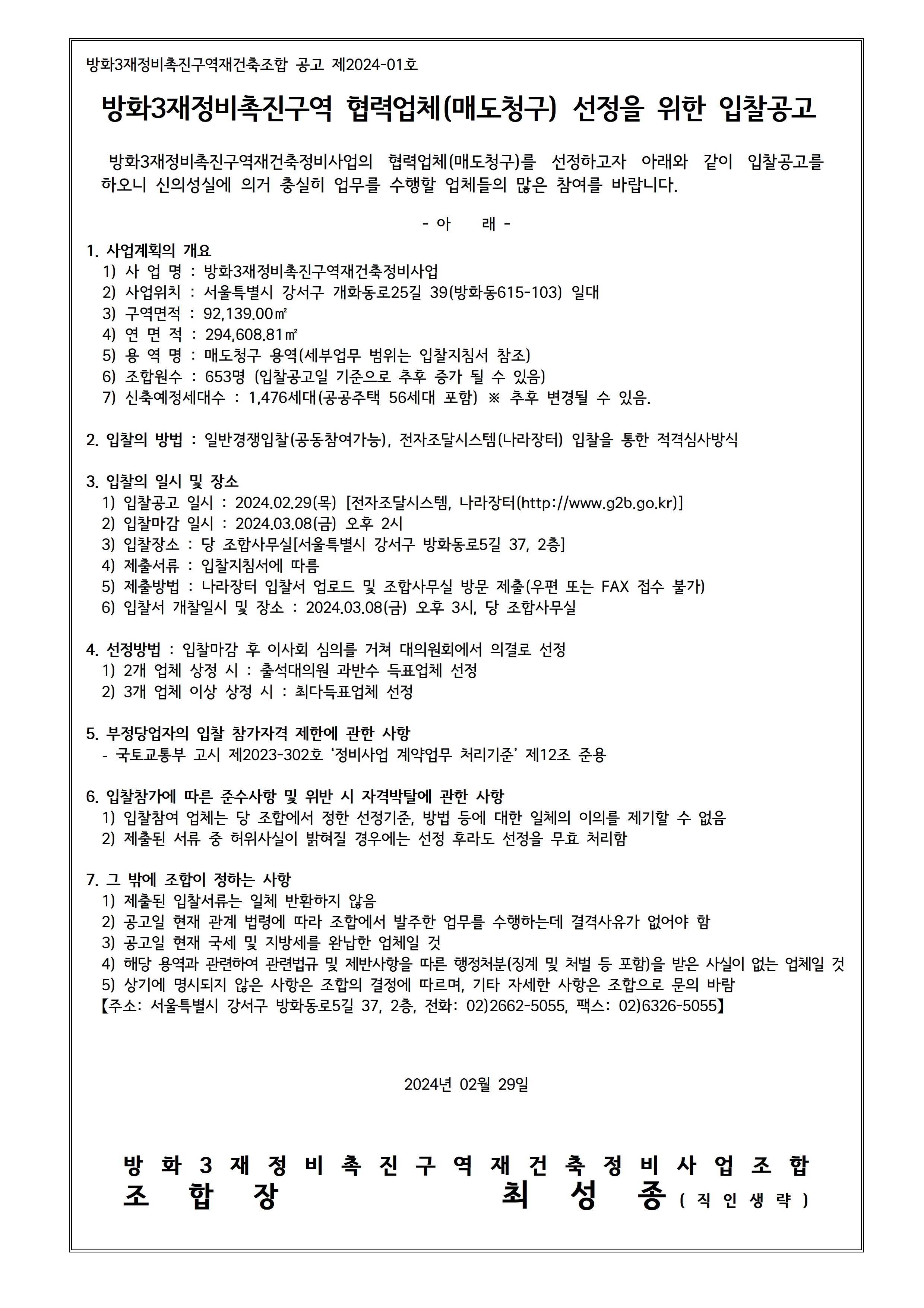 방화3재정비촉진구역 협력업체 (매도청구) 선정을 위한 입찰공고
