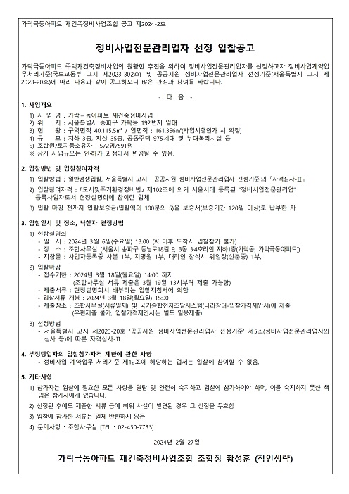 추진위원회/조합명 : 가락극동아파트 재건축사업 조합