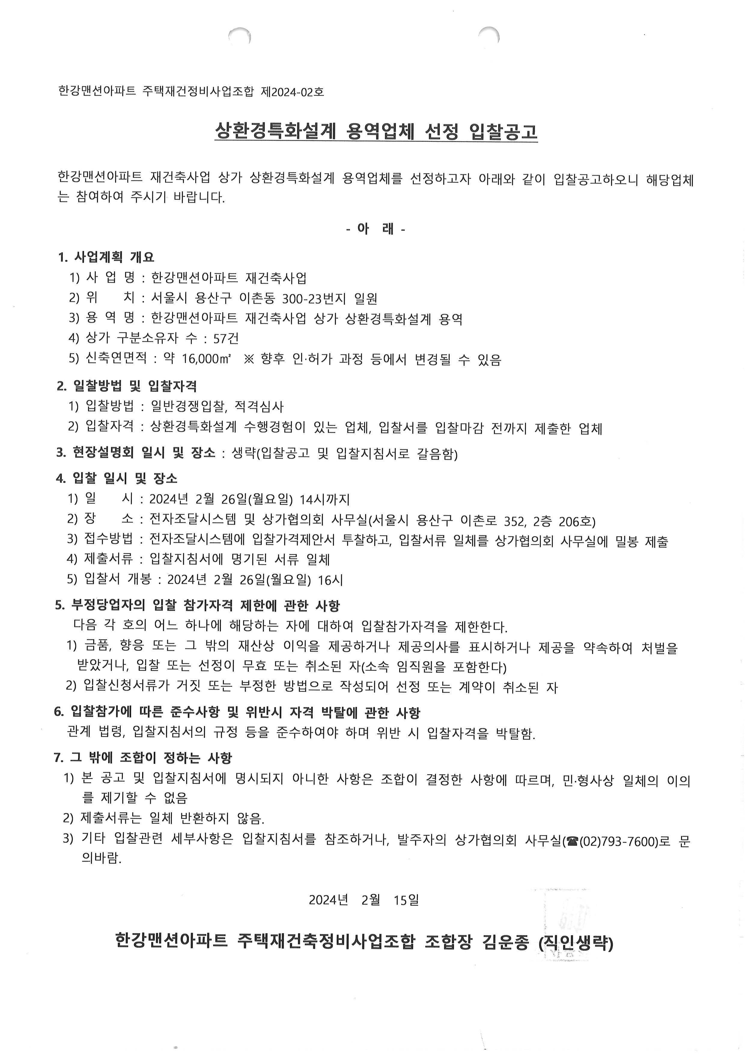 추진위원회/조합명 : 한강맨션아파트 주택재건축 조합