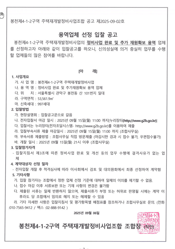 입찰명 : 정비사업 완료 및 추가 재원확보 용역업체 선정 입찰 공고