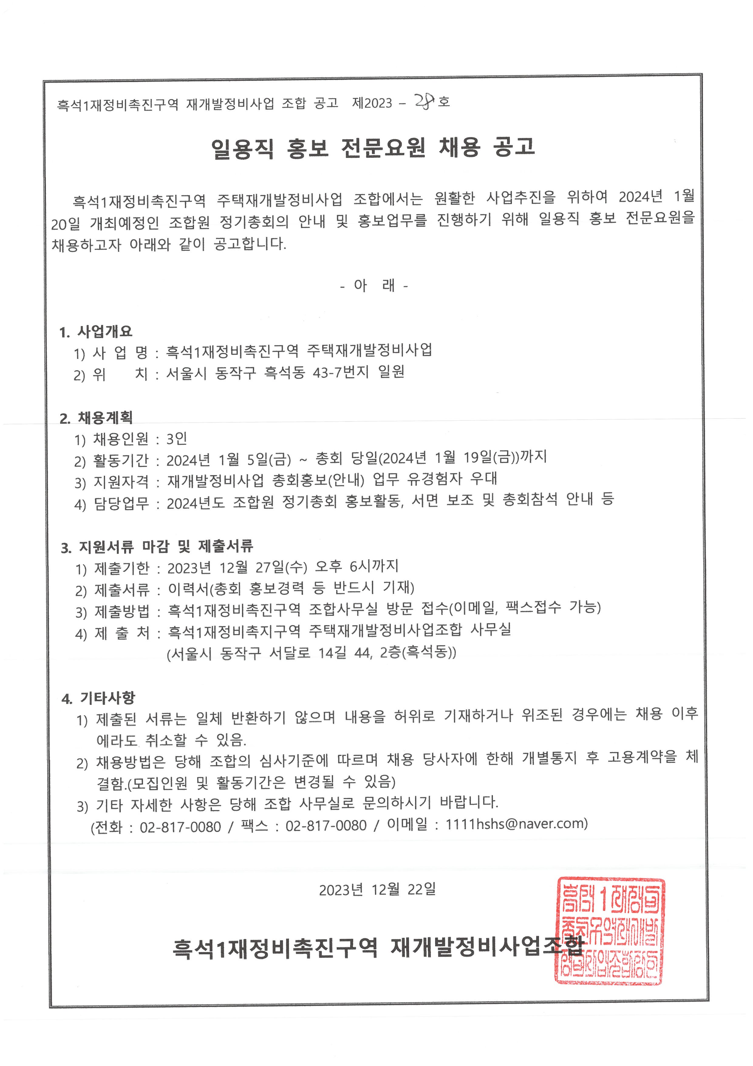 추진위원회/조합명 : 흑석1재정비촉진구역 재개발정비사업조합