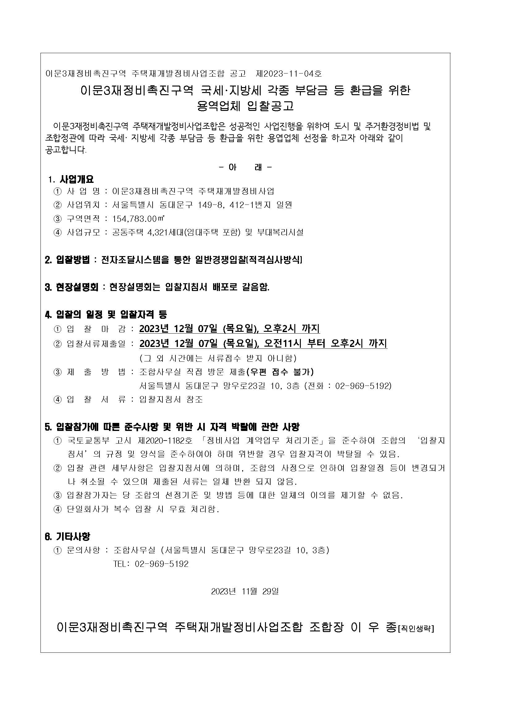 입찰명 : 이문3재정비촉진구역 국세·지방세 각종 부담금 등 환급을 위한 용역업체 입찰공고