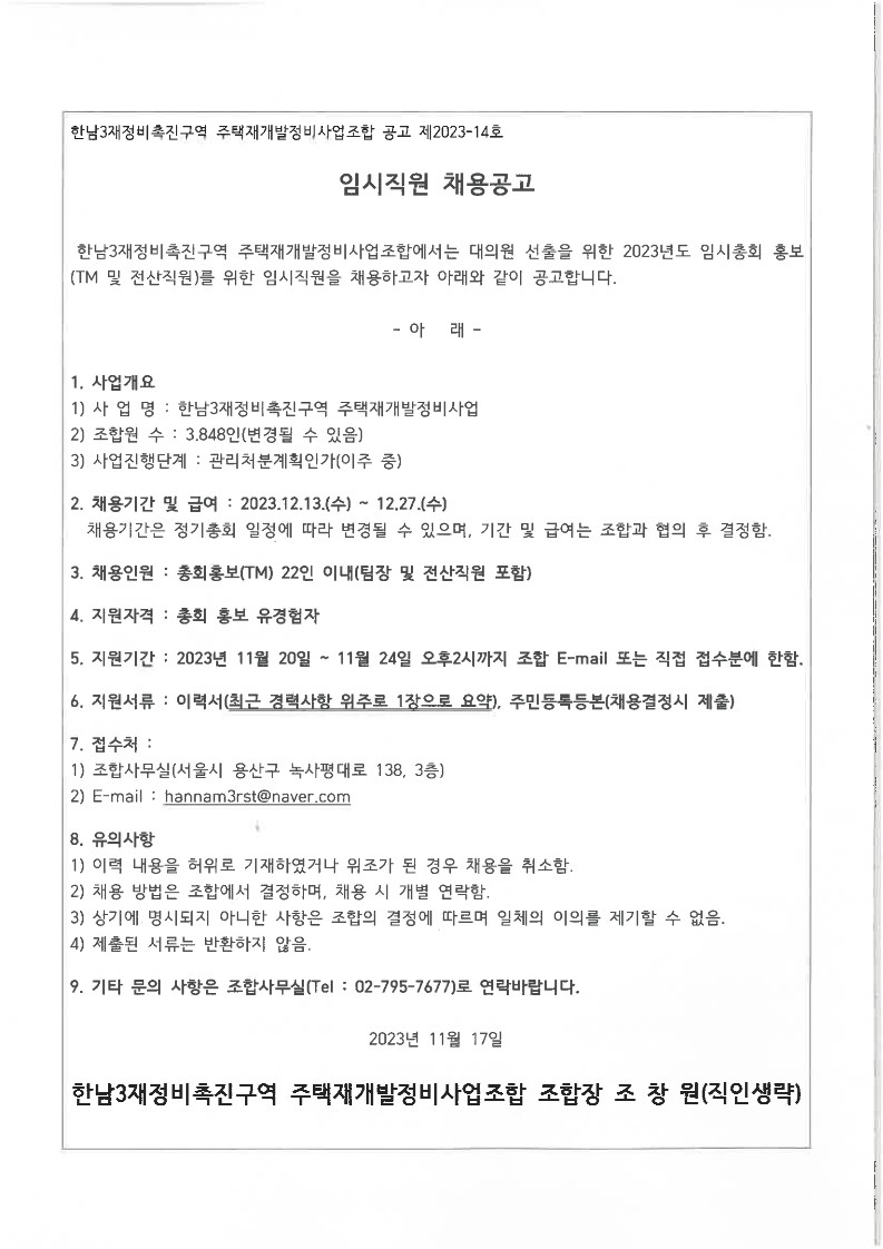 입찰명 : 231117 임시직원 채용공고(TM 및 전산직원)
