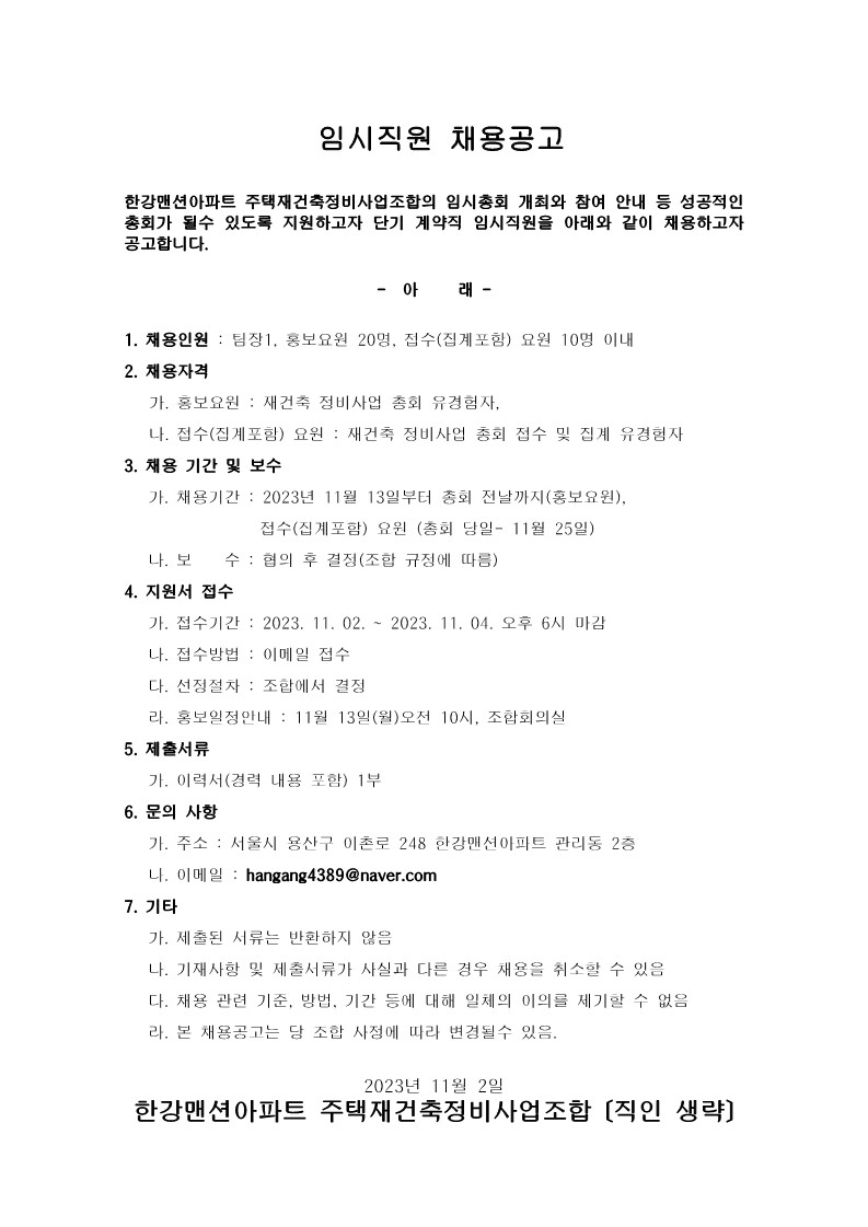추진위원회/조합명 : 한강맨션아파트 주택재건축 조합