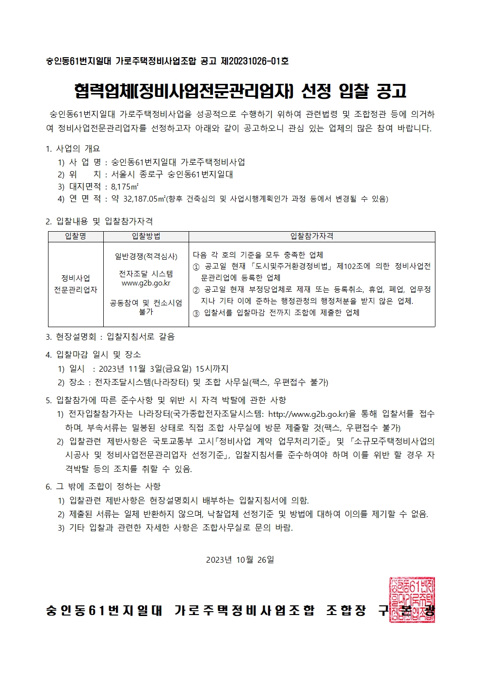 협력업체(정비사업전문관리업자)선정 입찰 공고