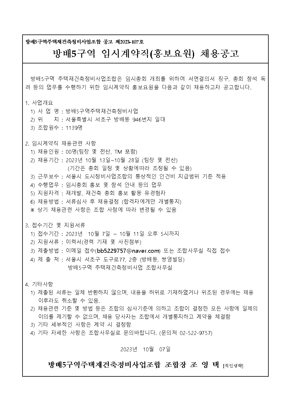 [공고] 방배5구역 임시계약직(홍보요원) 채용