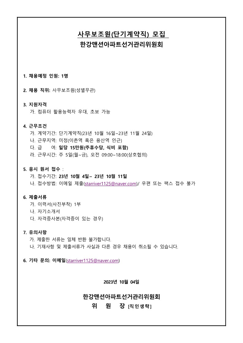 한강맨션아파트 주택재건축정비사업조합 선관위 사무보조원(단기계약직) 모집공고