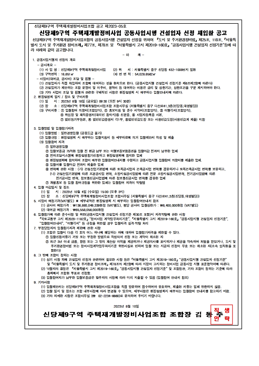 입찰명 : 신당제9구역 주택재개발정비사업 공동사업시행 건설업자 선정 재입찰 공고