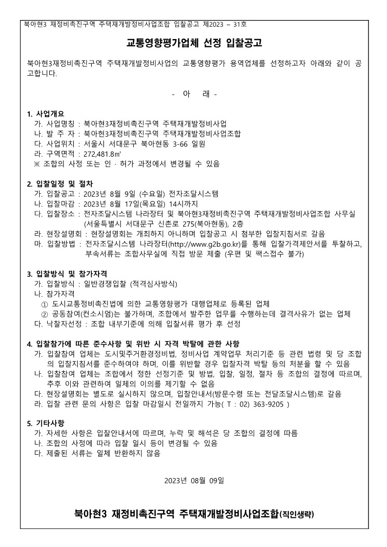 추진위원회/조합명 : 북아현 3 재정비촉진구역 주택재개발 정비사업조합