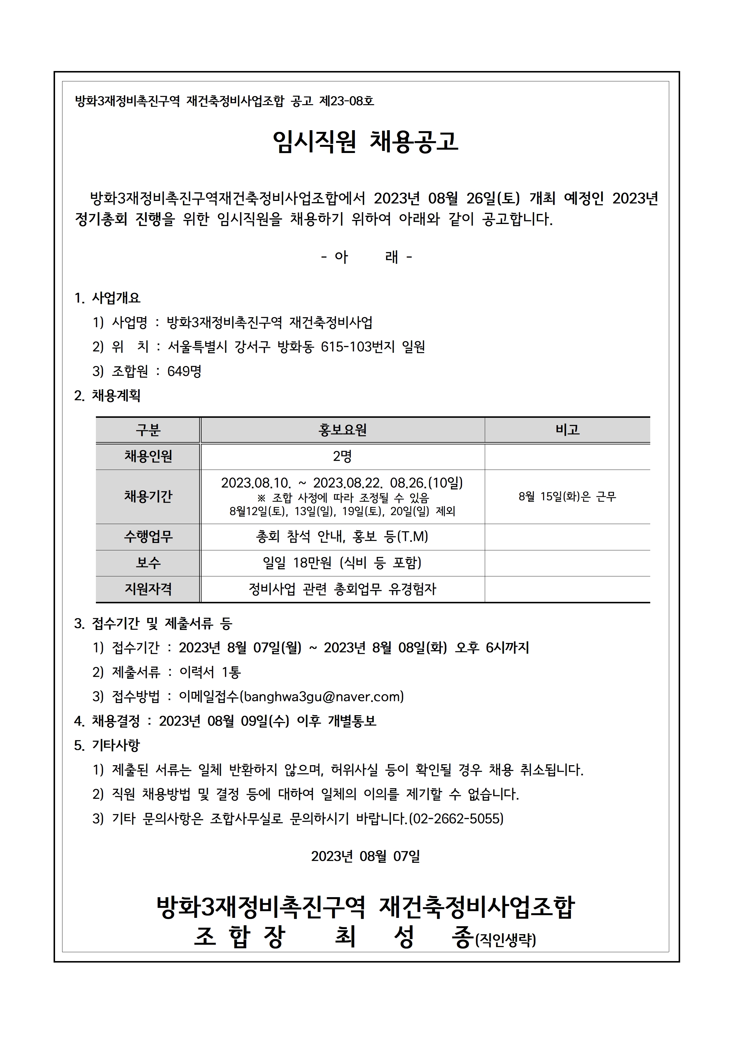 추진위원회/조합명 : 방화3재정비촉진구역 재건축정비사업조합
