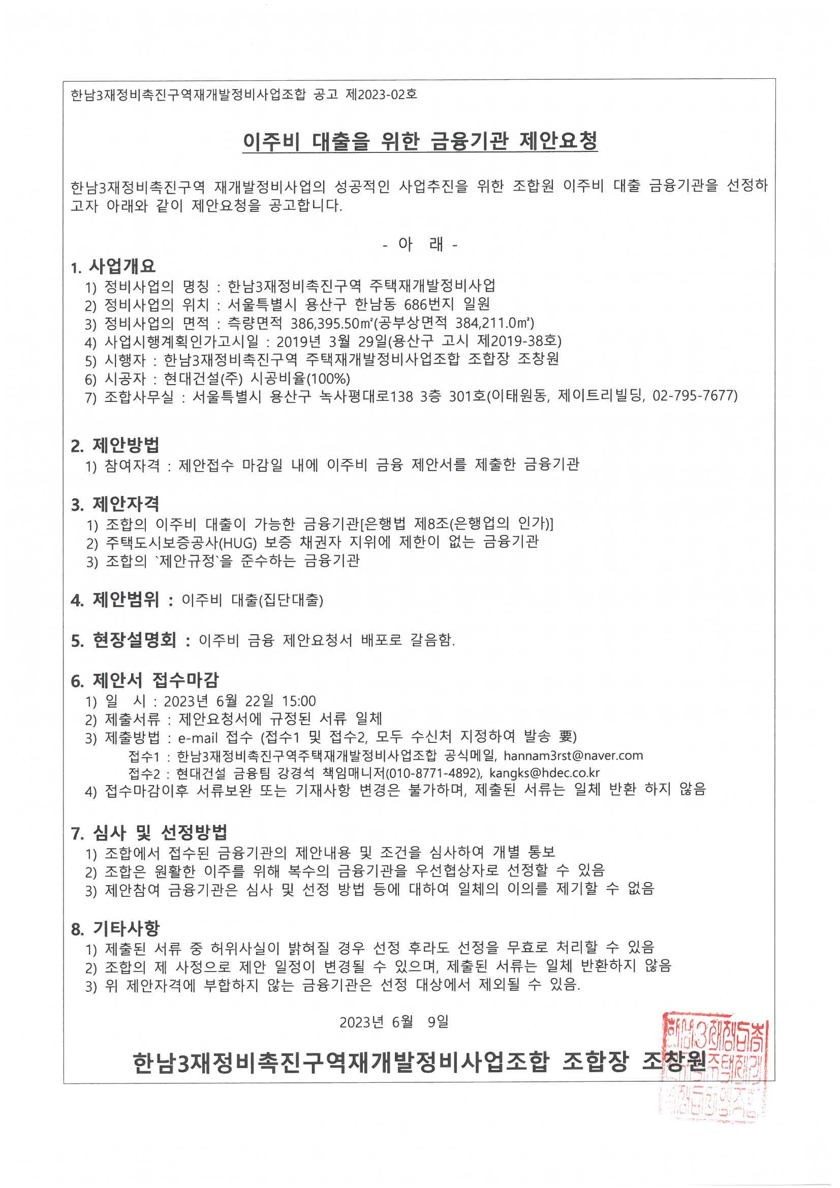 입찰명 : 230609 이주비 대출을 위한 금융기관 제안요청