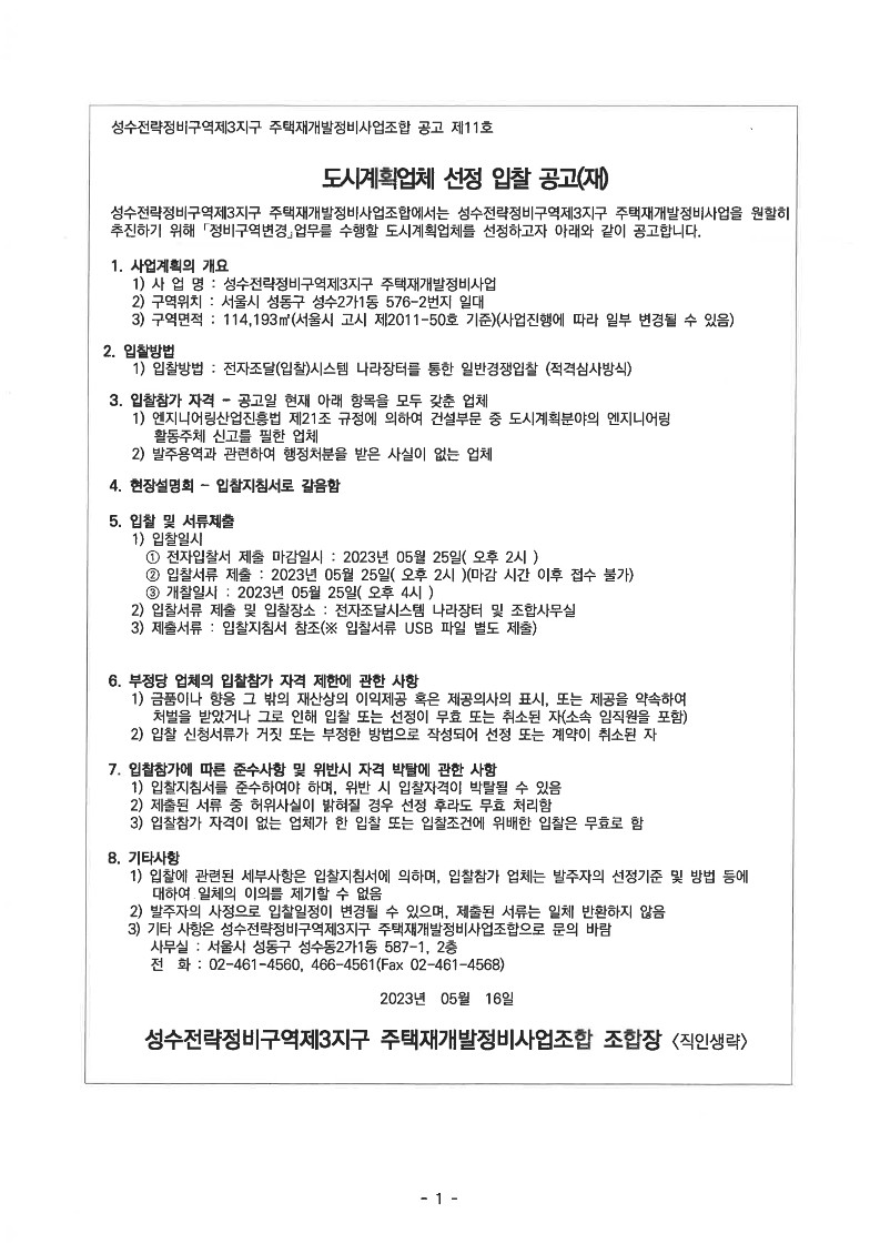 입찰명 : 성수전략정비구역제3지구 주택재개발정비사업 도시계획업체 선정