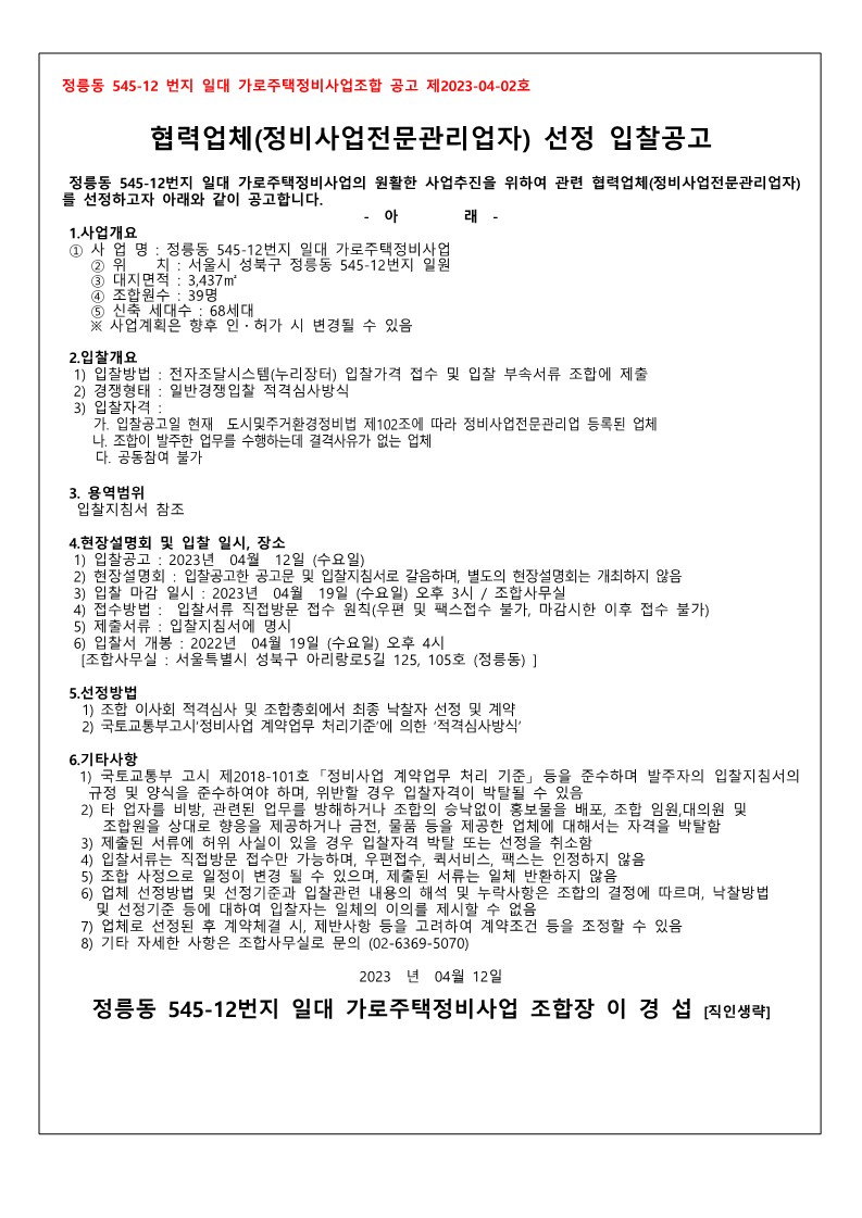 정비사업전문관리업자 입찰공고