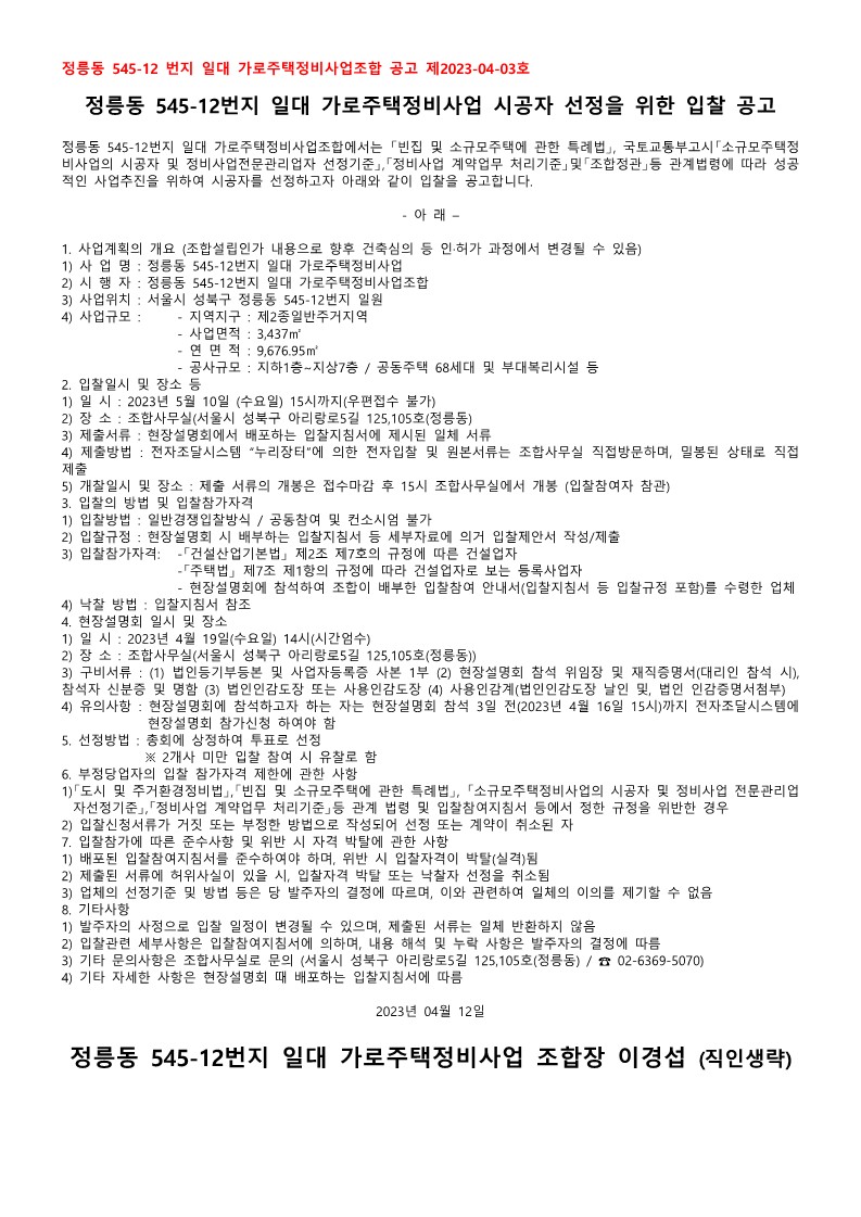 추진위원회/조합명 : 정릉동 545-12번지 일대 가로주택정비사업