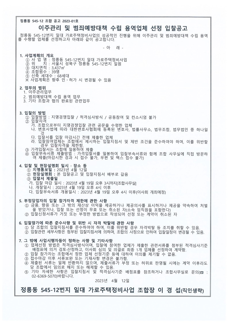 이주범방 업체 선정 입찰공고