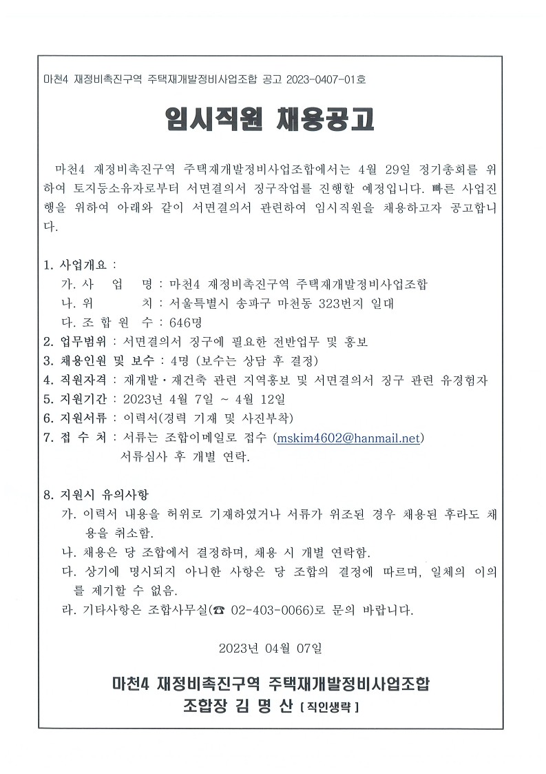추진위원회/조합명 : 마천4재정비촉진구역 주택재개발정비사업조합