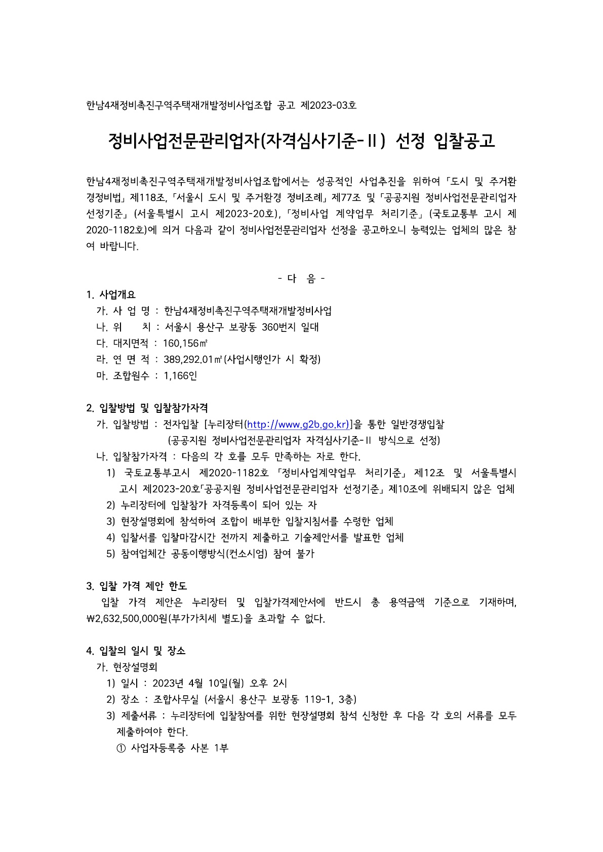 입찰명 : 정비사업전문관리업자 선정 입찰 공고