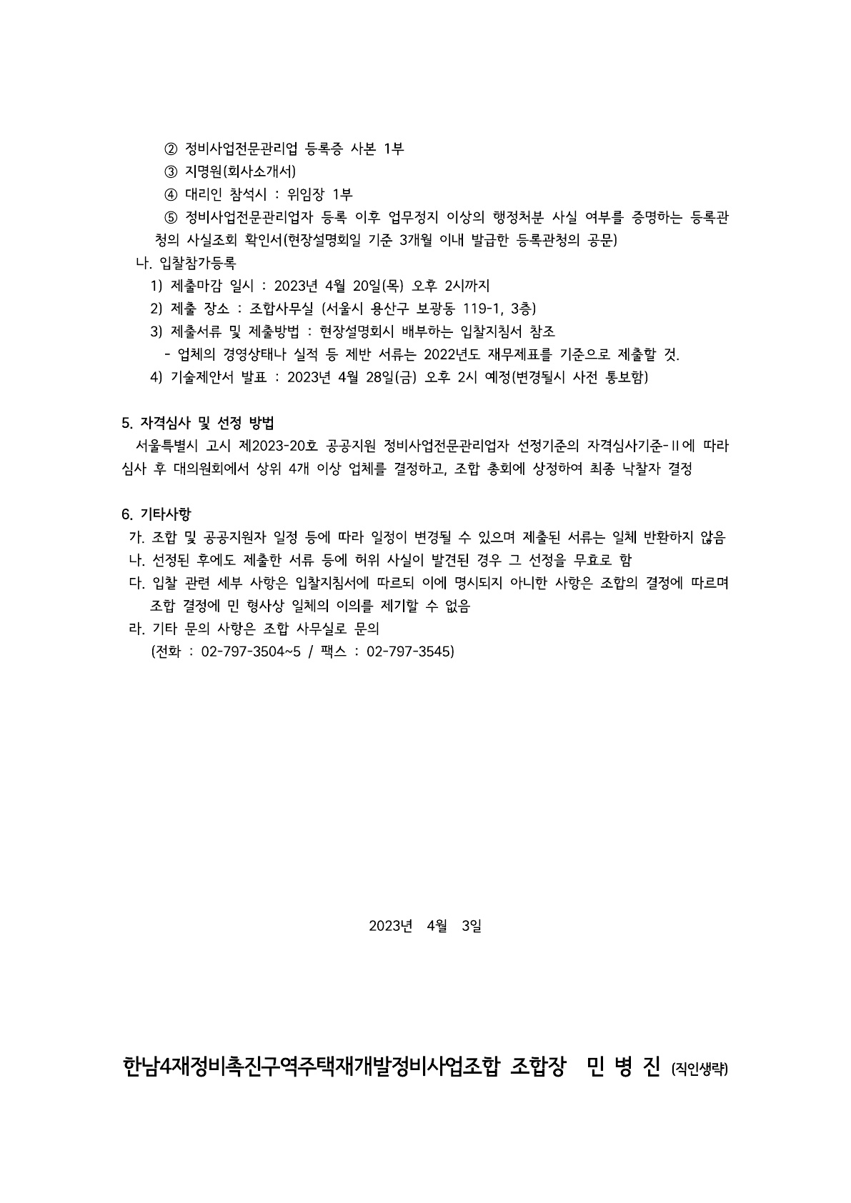 선정방법 : 서울특별시 고시 제2023-20호 공공지원 정비사업전문관리업자 선정기준의 자격심사기준-Ⅱ에 따라 심사 후 대의원회에서 상위 4개 이상 업체를 결정하고, 조합 총회에 상정하여 최종 낙찰자 결정
