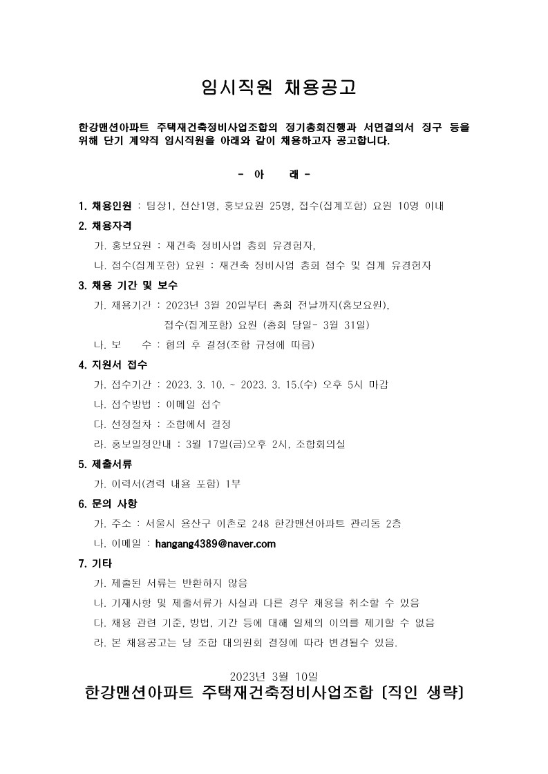 입찰명 : 한강맨션 주택재건축정비사업조합 총회 임시직원 채용공고