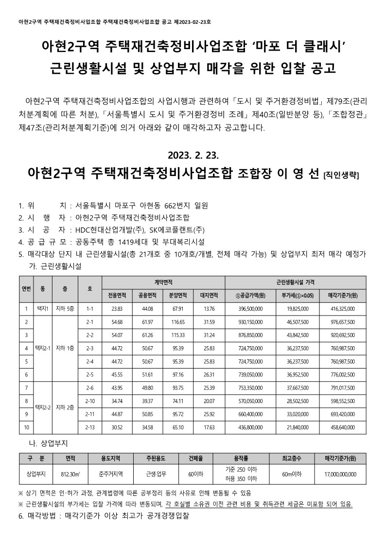 아현2구역 주택재건축정비사업조합 [마포 더 클래시] 근린생활시설 및 상업부지 매각을 위한 입찰 공고